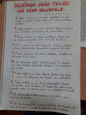 En la clase de 3º C hemos visto los textos normativos y prescriptivos y he propuesto una actividad que ha consistido en elaborar un decálogo que recogiera 10 normas básicas para realizar un desayuno, una comida o una cena saludable (a elección de cada uno de los alumnos, ya que ha sido un trabajo individual) Además el decálogo tenía que venir acompañado de una receta de cocina siguiendo las normas establecidas en el mismo.
